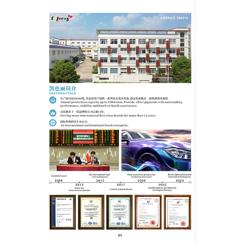 Application in different fields: These characteristics make crystal high-color pearlescent pigments widely used in various fields, such as automotive painting, home decoration, industrial design and artistic creation. In these applications, the light reflection performance of the pigment can add unique visual effects and quality to the product or work.